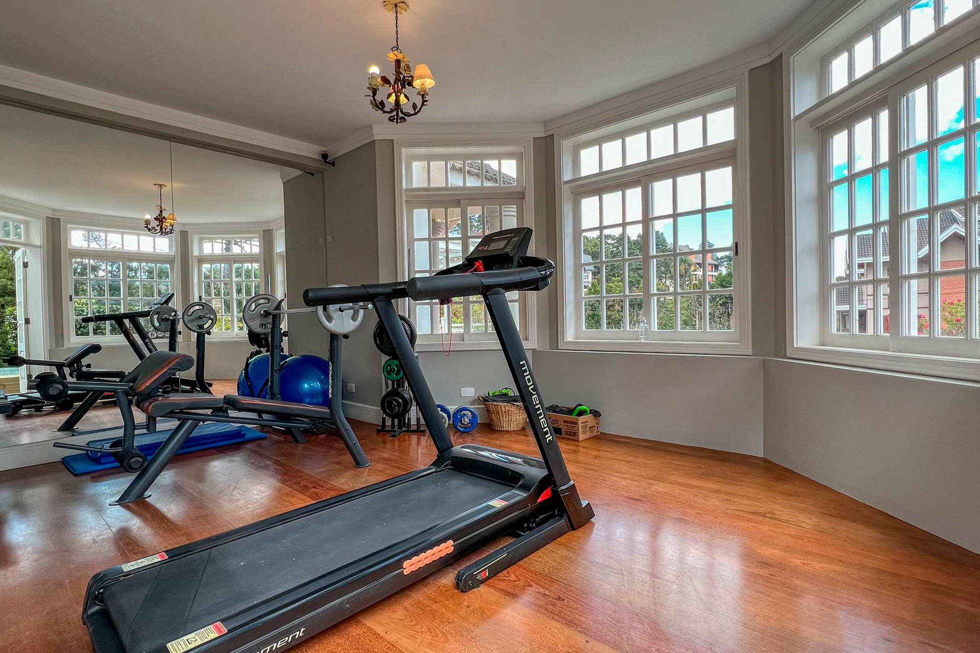 Academia equipada para exercícios aeróbicos e peso livre, com vista para os jardins do hotel.