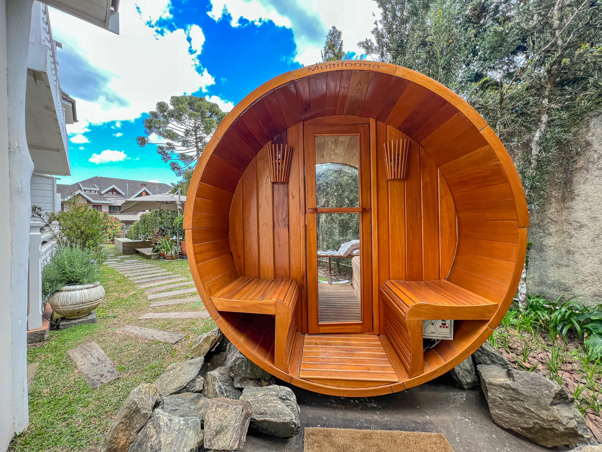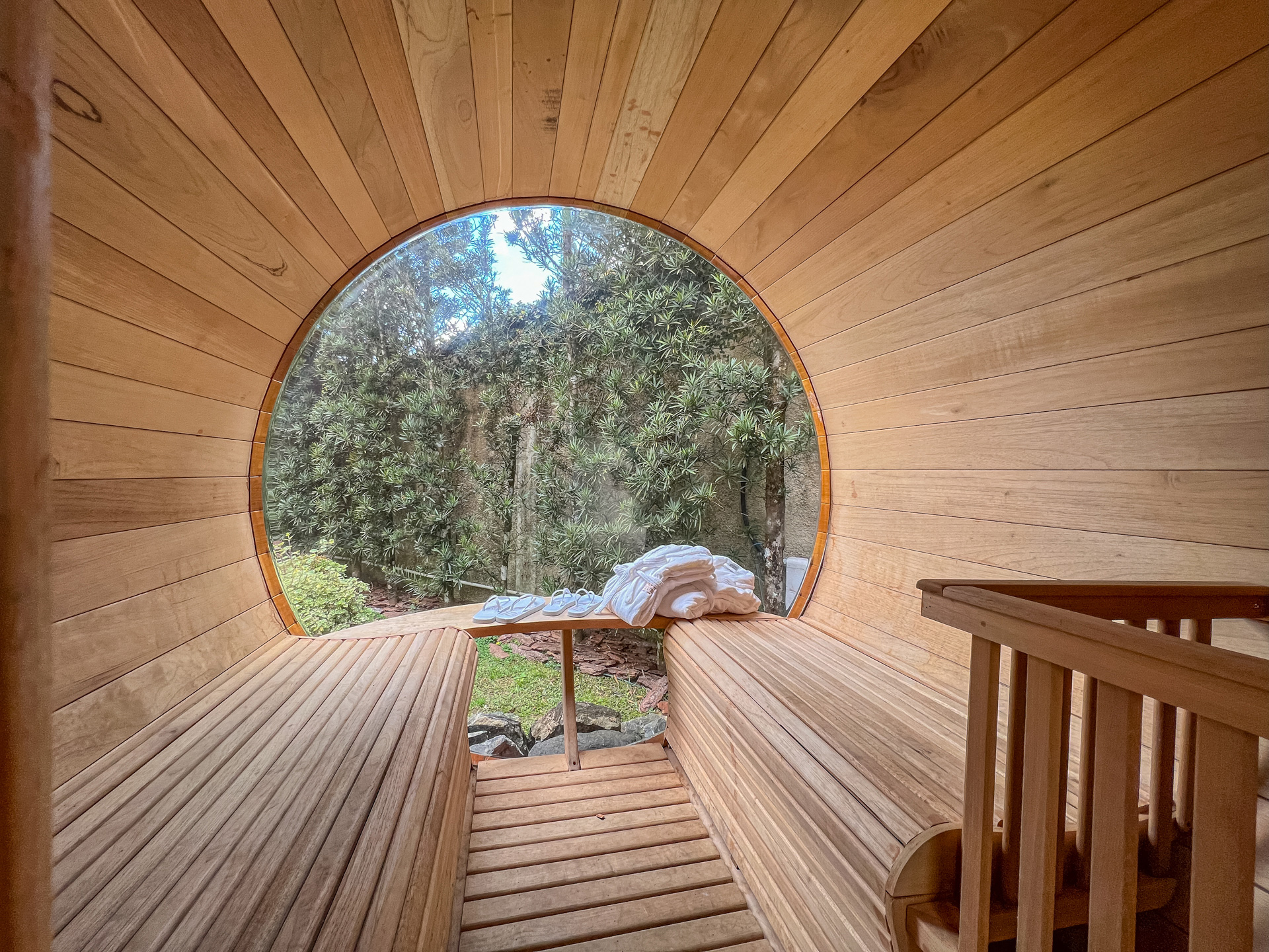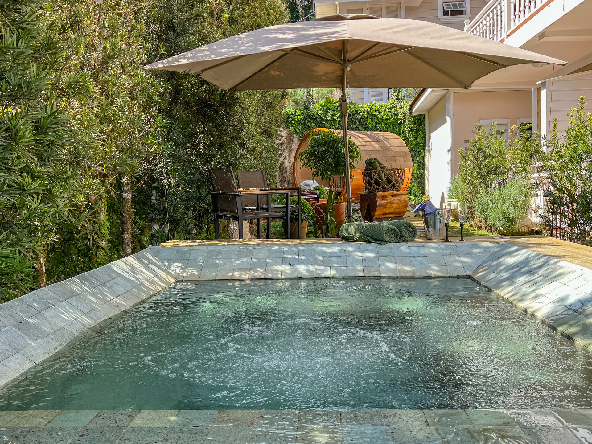 Sauna confeccionada em madeira Cedro Rosa com propriedades terapêuticas, jacuzzi ao ar livre, aquecida e construída em pedra Hijau, com hidromassagem, ozonioterapia e cromoterapia.