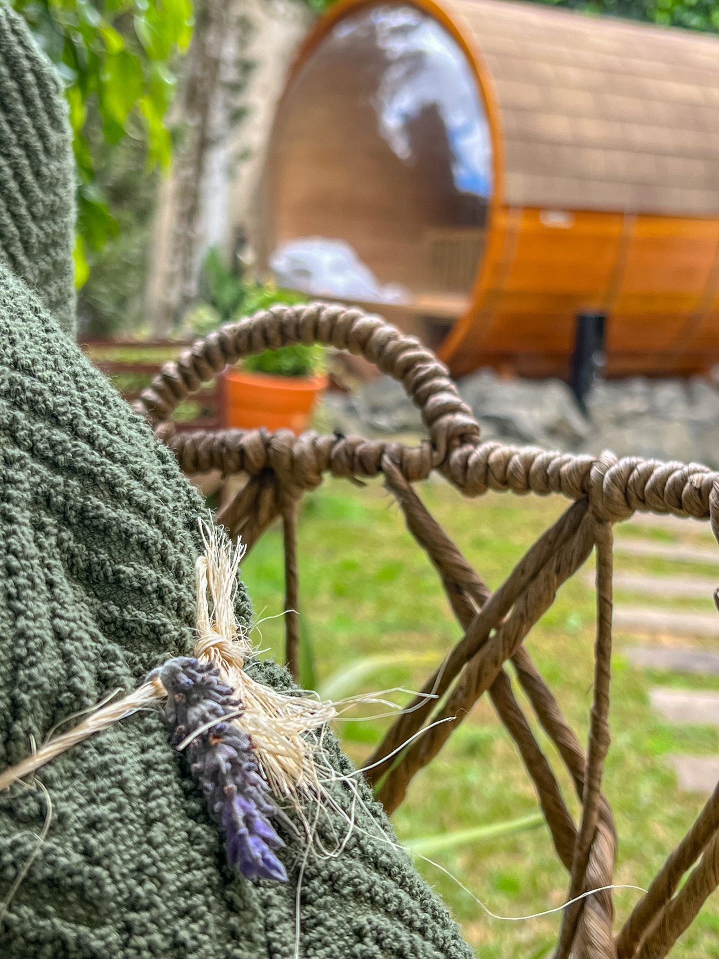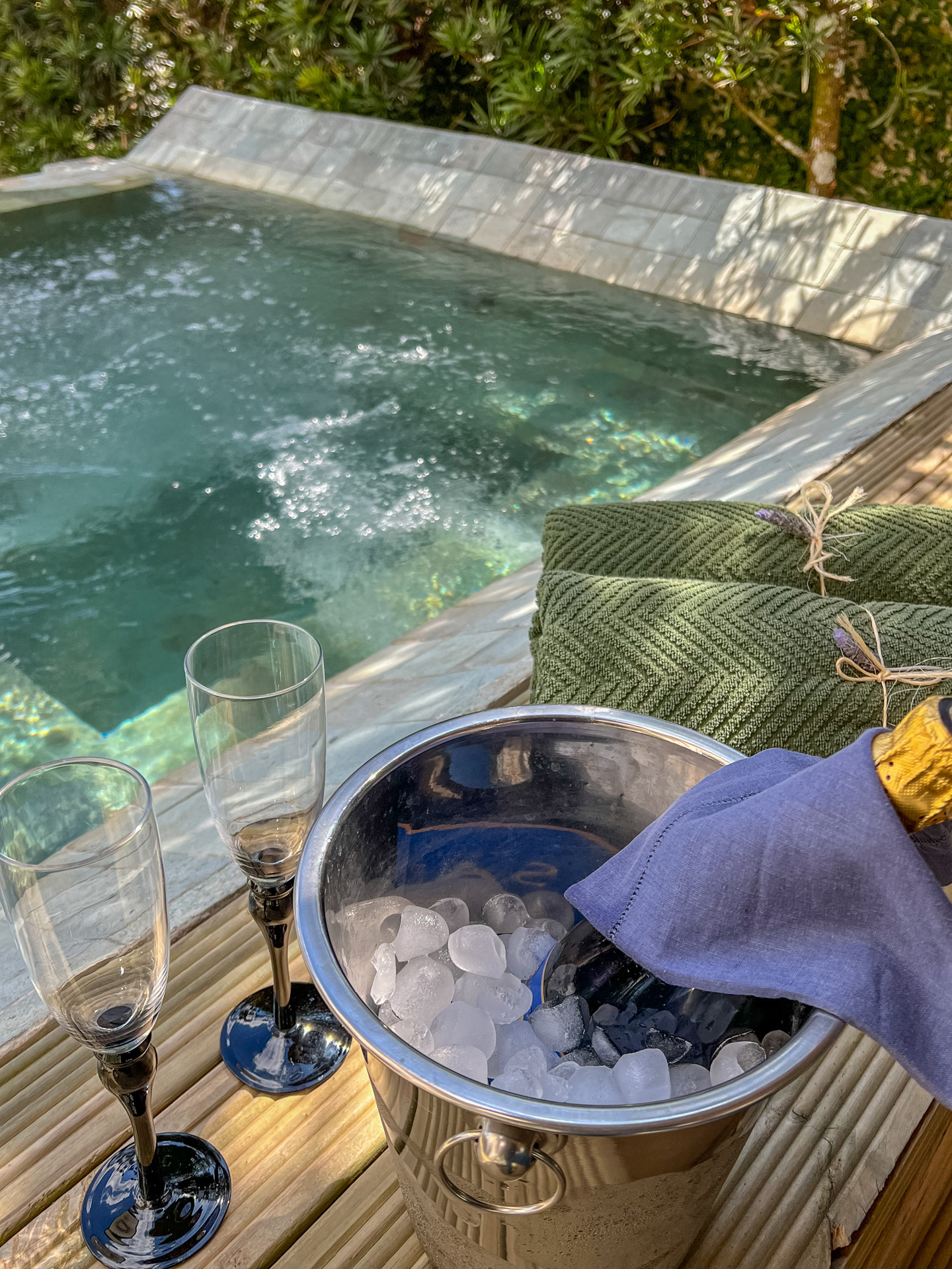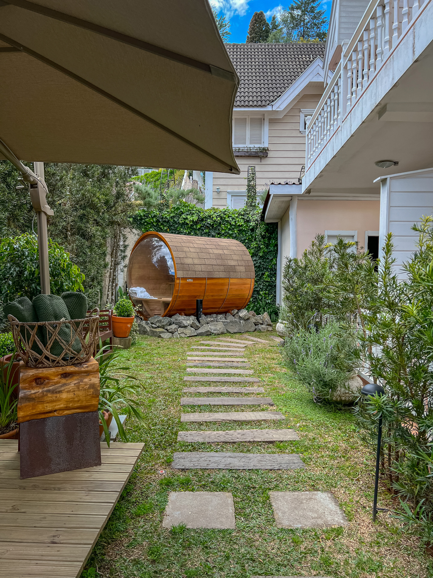 Sauna confeccionada em madeira Cedro Rosa com propriedades terapêuticas, jacuzzi ao ar livre, aquecida e construída em pedra Hijau, com hidromassagem, ozonioterapia e cromoterapia.
