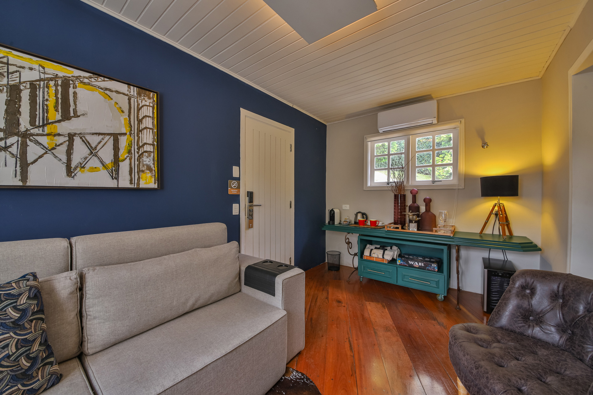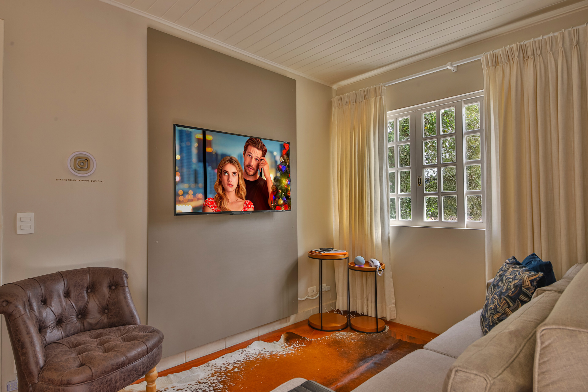 A decoração dos quartos é preenchida com detalhes luxuosos, uma deliciosa cama Queen Size, com lençóis egípcios, travesseiros e edredons de plumas, e todas as mordomias para um sono tranquilo e confortável. No living temos Smart TV 50”, e confortável sofá, inserido em meio a toda decoração, proporcionando momentos de descontração em meio a toda esta atmosfera que pode ser acompanhada, de belos vinhos da nossa adega Secreto, com curadoria Grand-Crú.