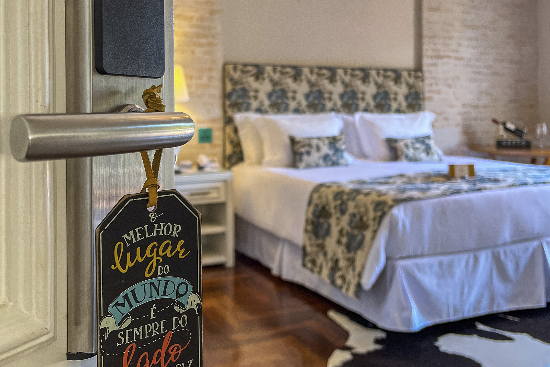 A elegância da Suíte Secreto chama a atenção já na primeira impressão, com decoração que realça os toques clássicos, unindo o conforto e modernidade, mas é ao acender as luzes que a delicadeza aparece em lindos abajures e no lustre. Esta categoria possui design elegante em área aproximada de 52m², localizada no 1º pavimento.