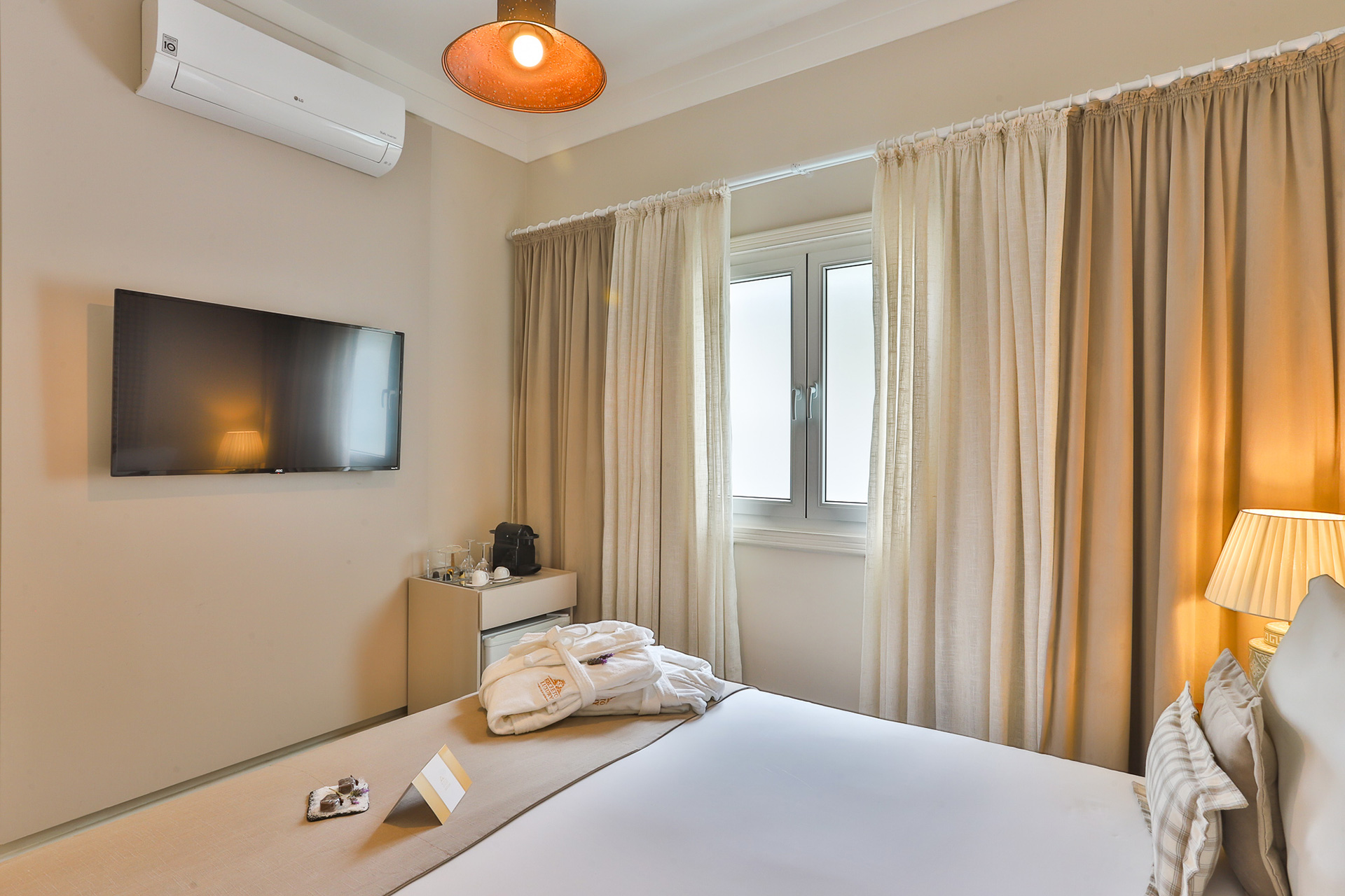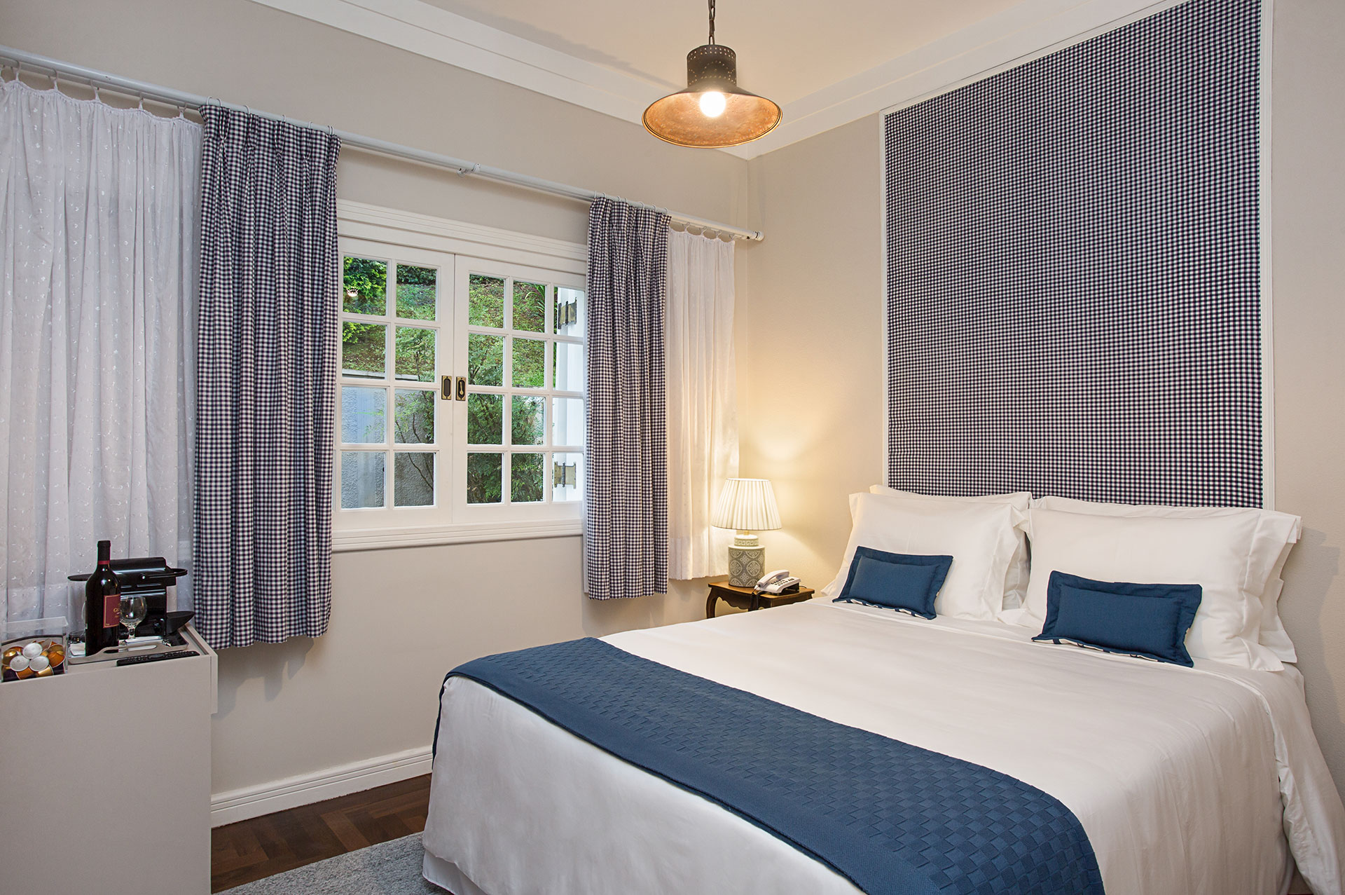A decoração moderna com leves toques retrô, dão a suíte com área aproximada de 25m², uma atmosfera delicada em tons de branco, cinza e azul marinho, com vista para o jardim do hotel.